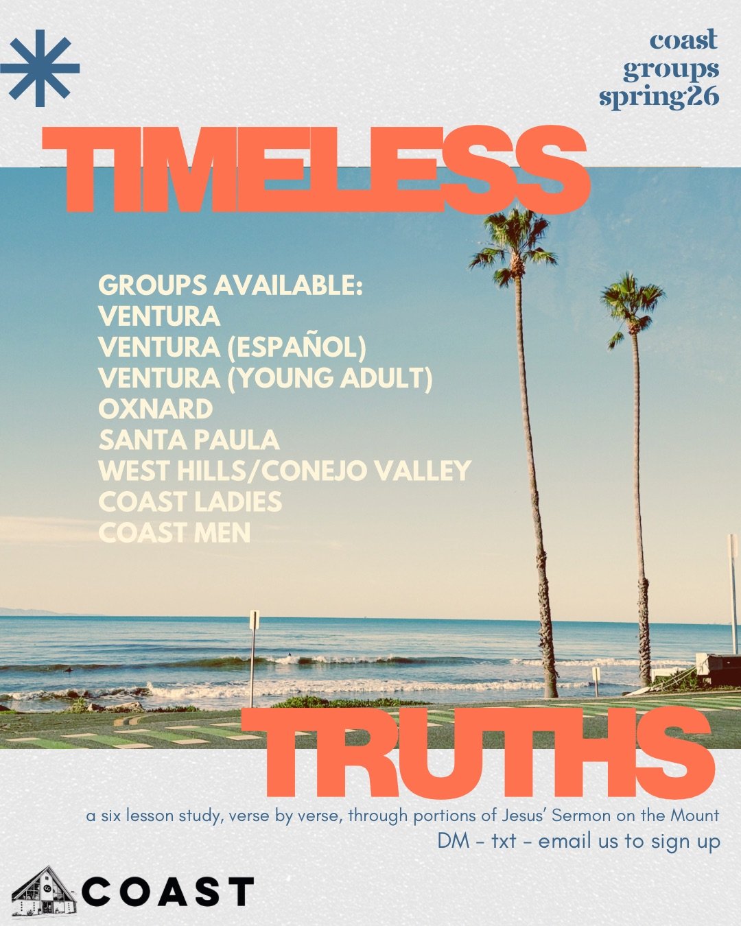 /Coast Groups are BACK! If you’re looking for a great place to connect with other believers, search the Scriptures together, this is it. We’re doing a verse by verse study on portions of Jesus’ Sermon on the Mount called “Timeless Truths”. We have Bible study home groups and public setting (cafes/eatery) available in Ventura, Oxnard, Santa Paula, Calabasas/West Hills, a Hyphen (Young Adult) group, and a Spanish group as well. If you’d like to sign up for a group text 805-668-1456. And if you’re in a group, HERE is the digital version of wk1 handout.